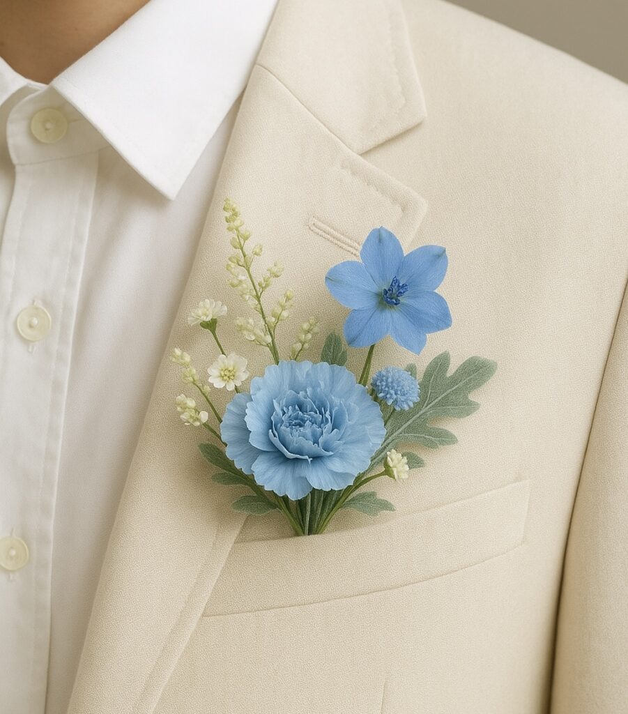 - Phù hợp trang phục: chọn boutonnière hài hòa với màu vest và cravat.